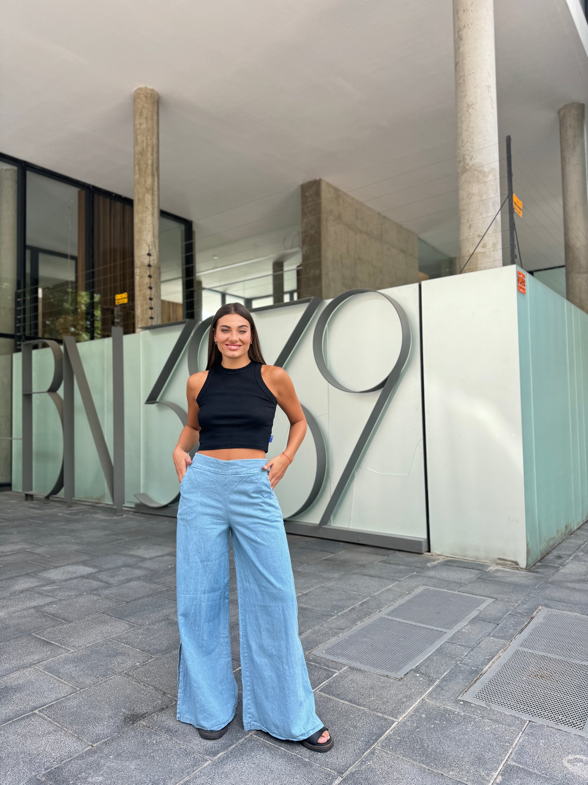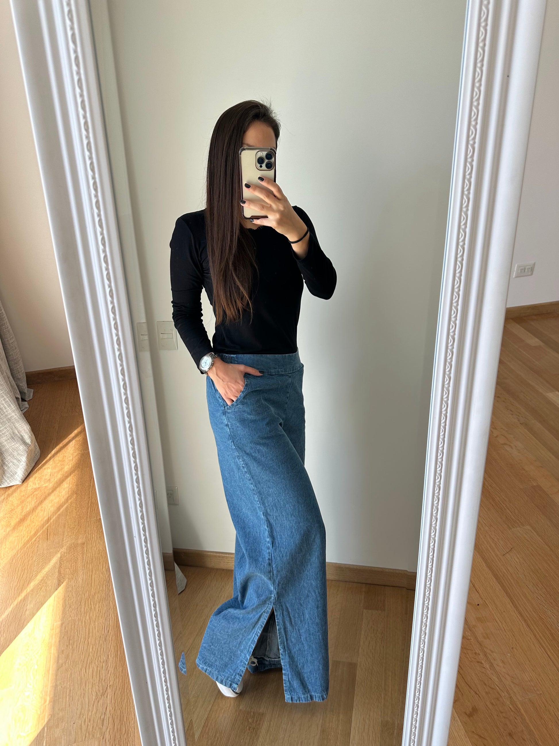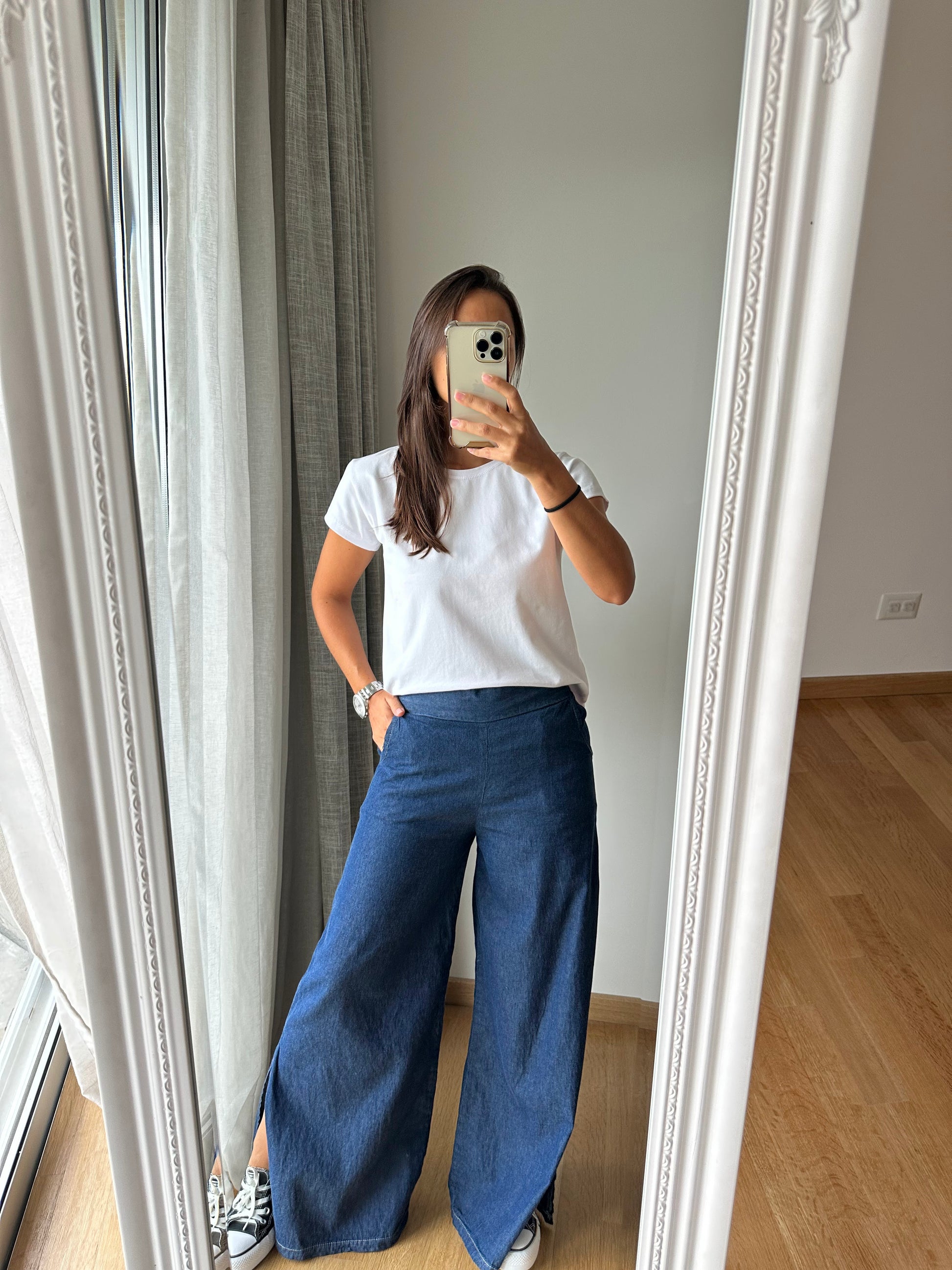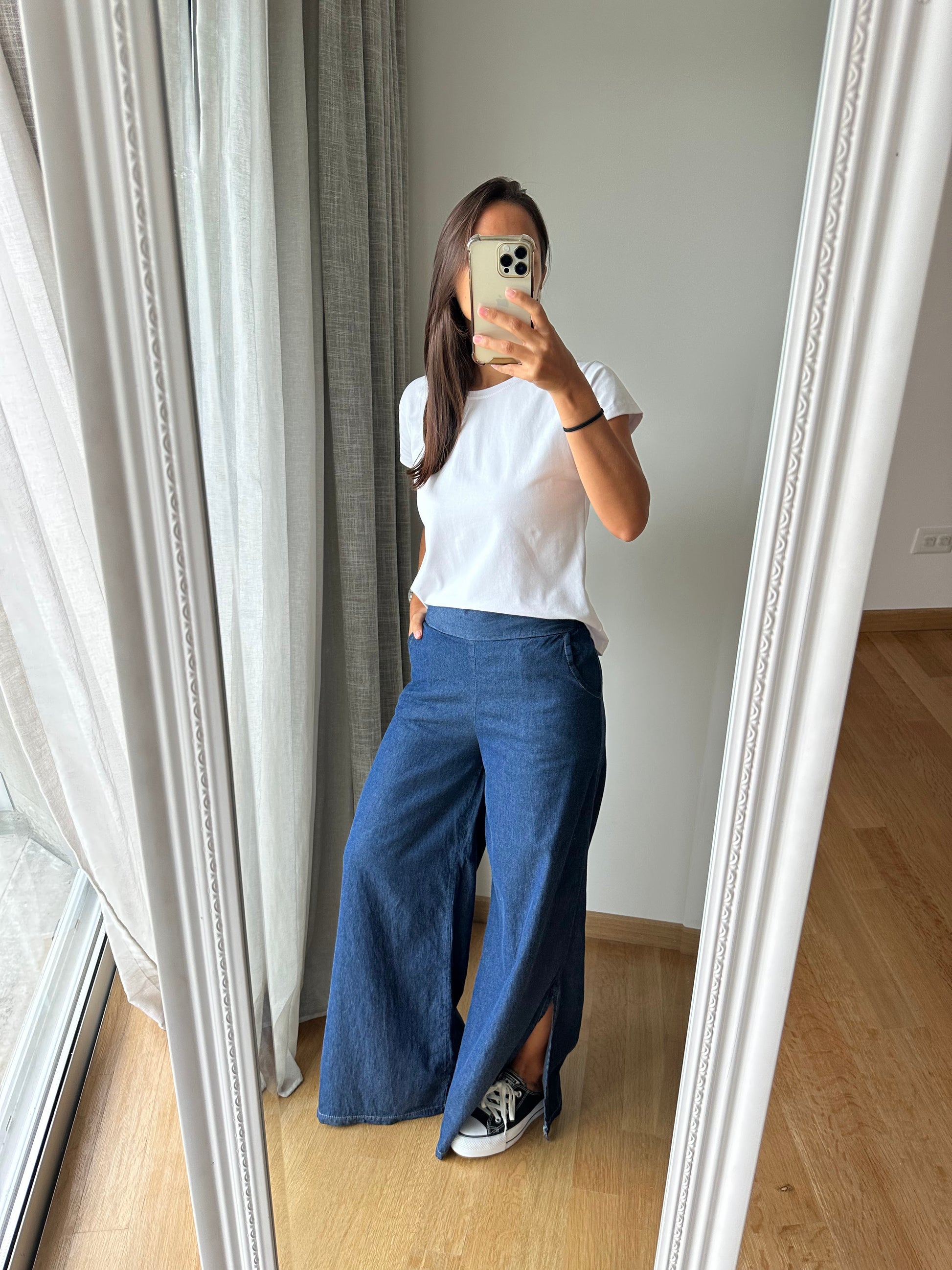 Palazzo de tela Jeans, cintura elasticada en la parte trasera y aberturas a los costados de los tobillos