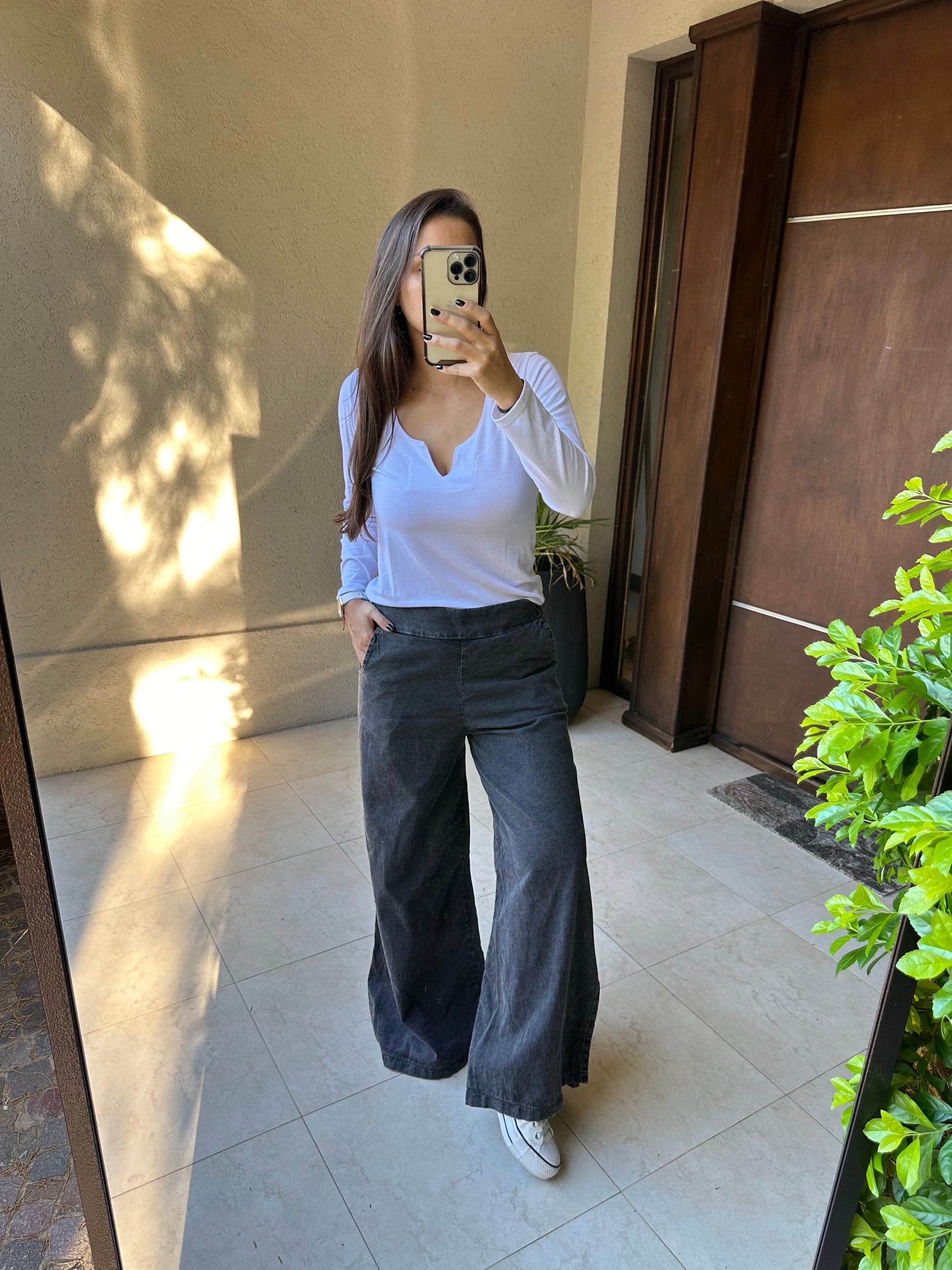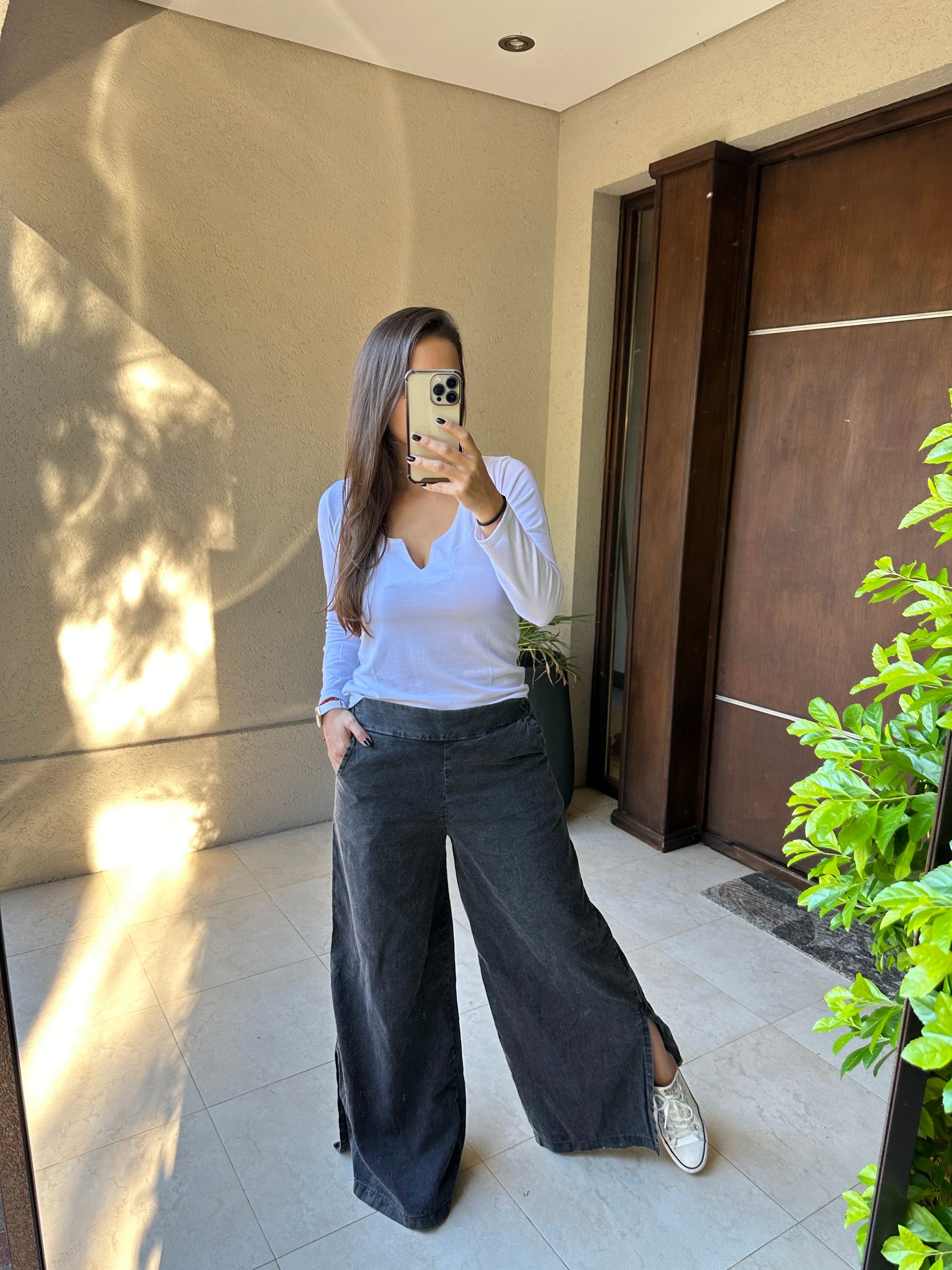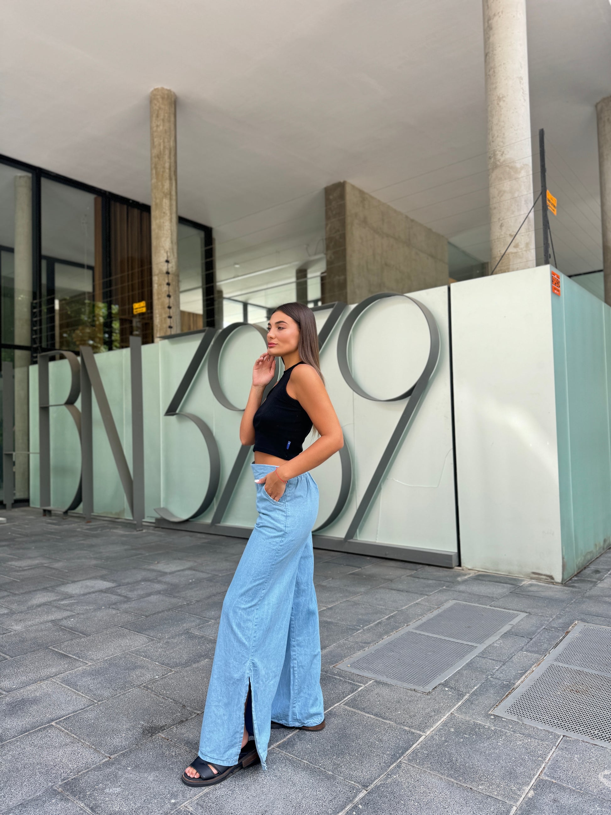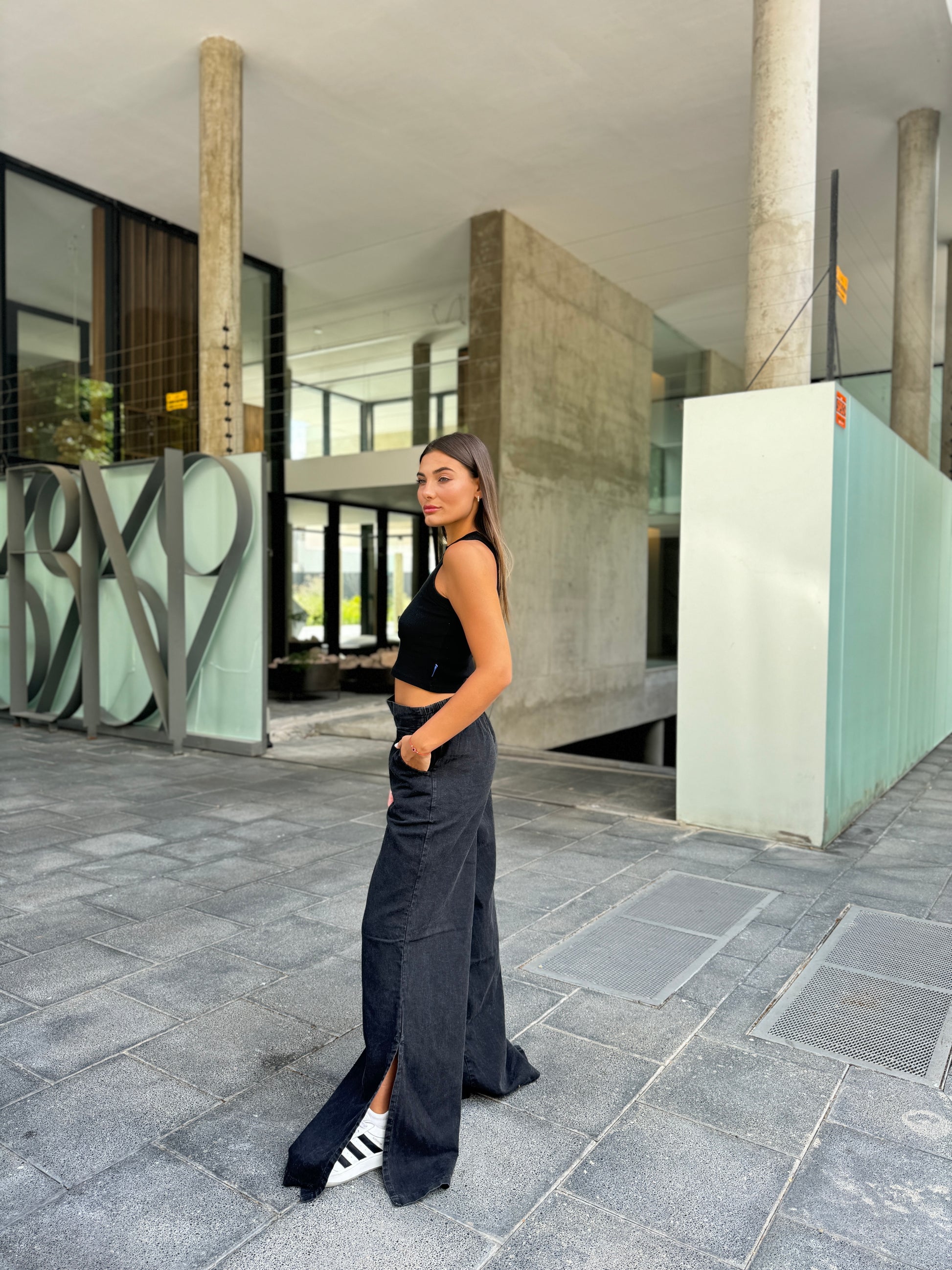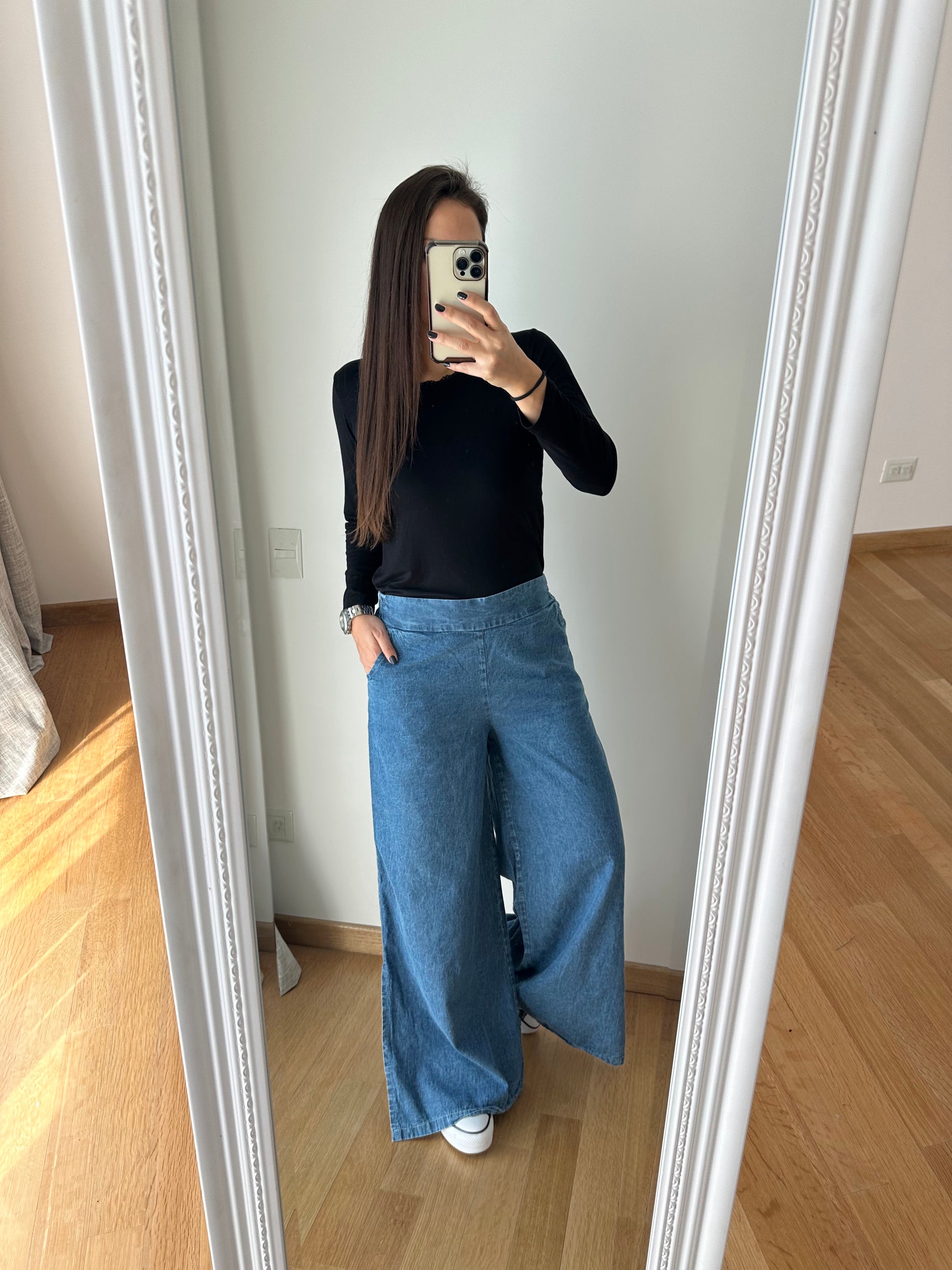 Palazzo de tela Jeans, cintura elasticada en la parte trasera y aberturas a los costados de los tobillos
