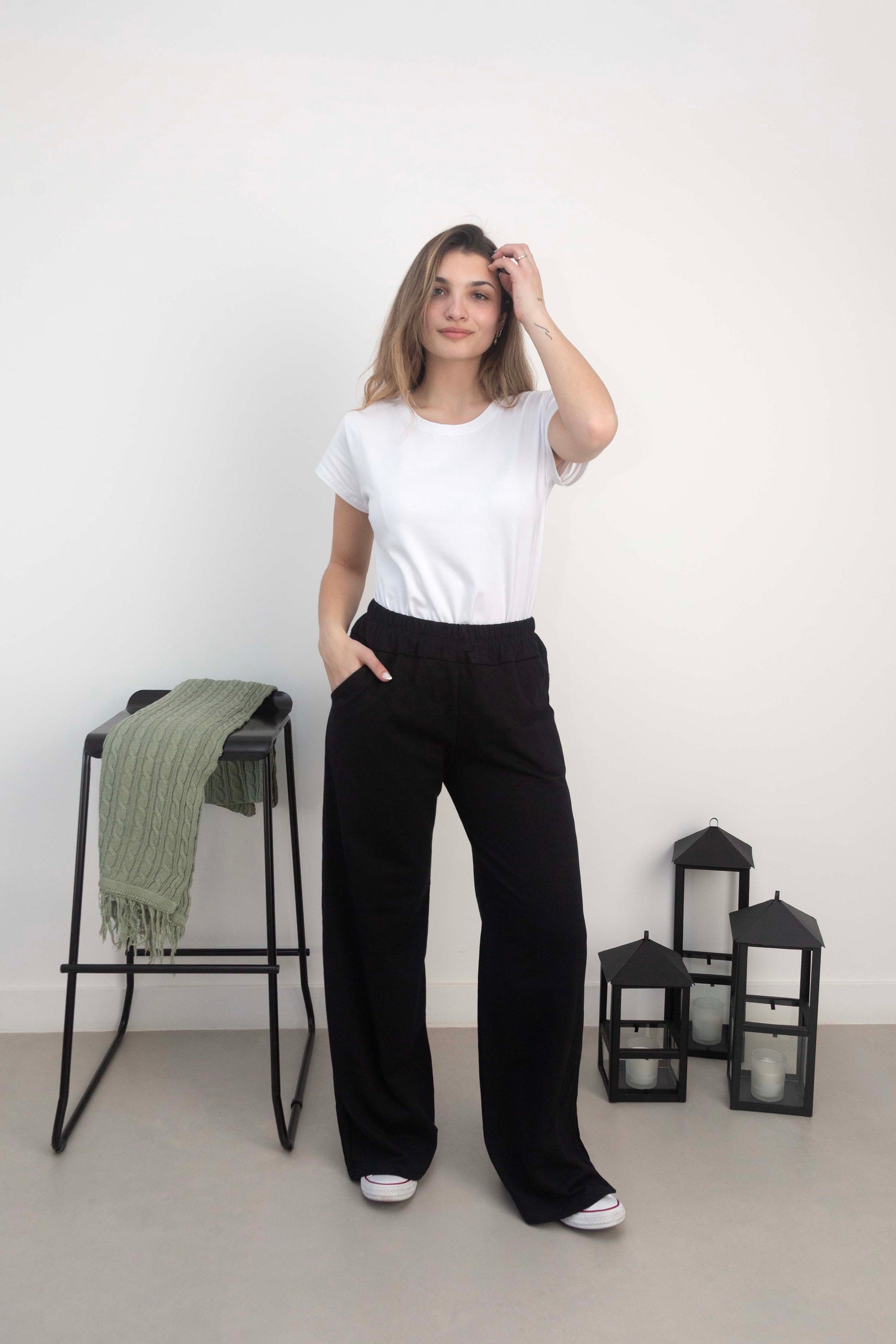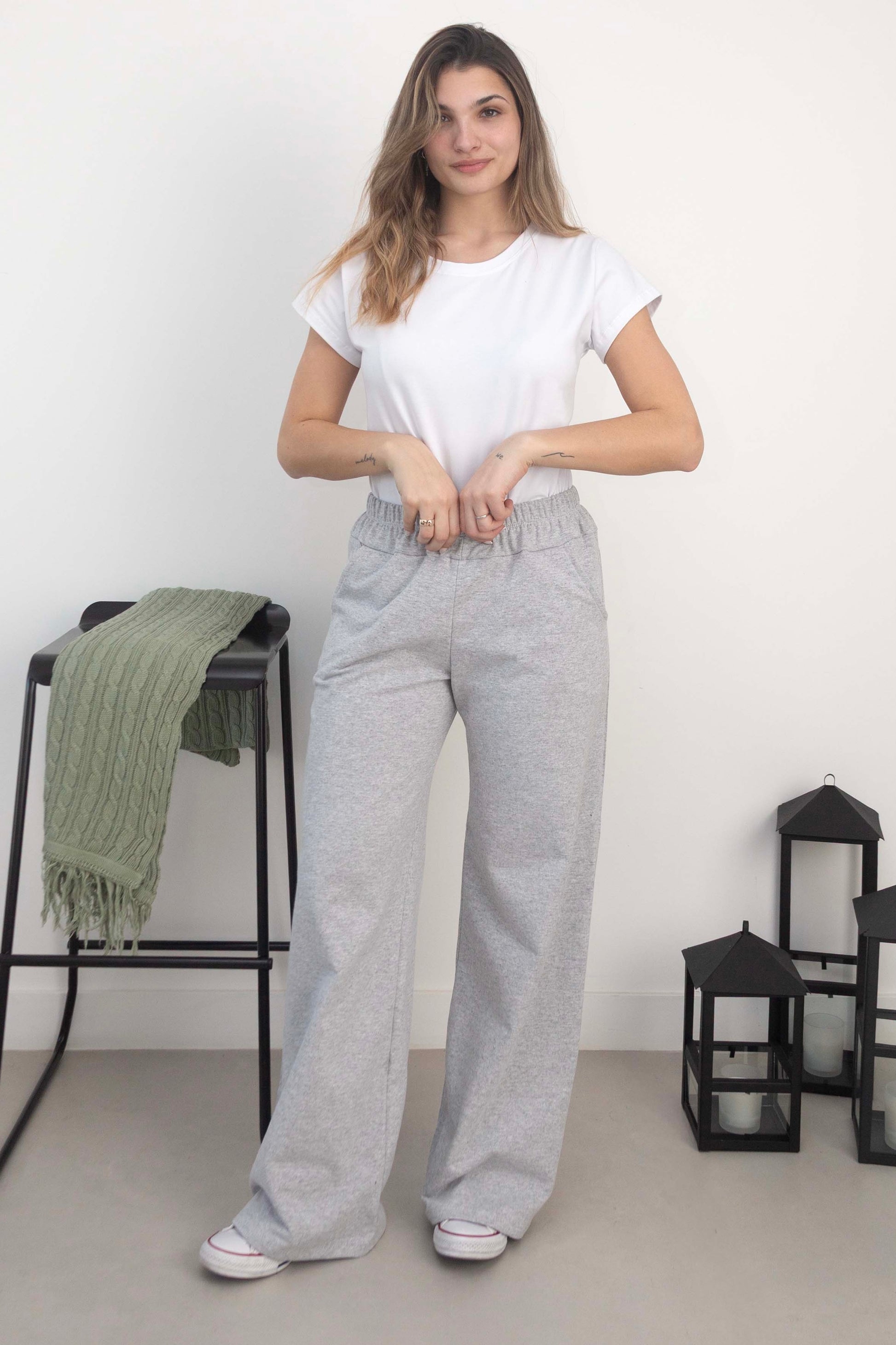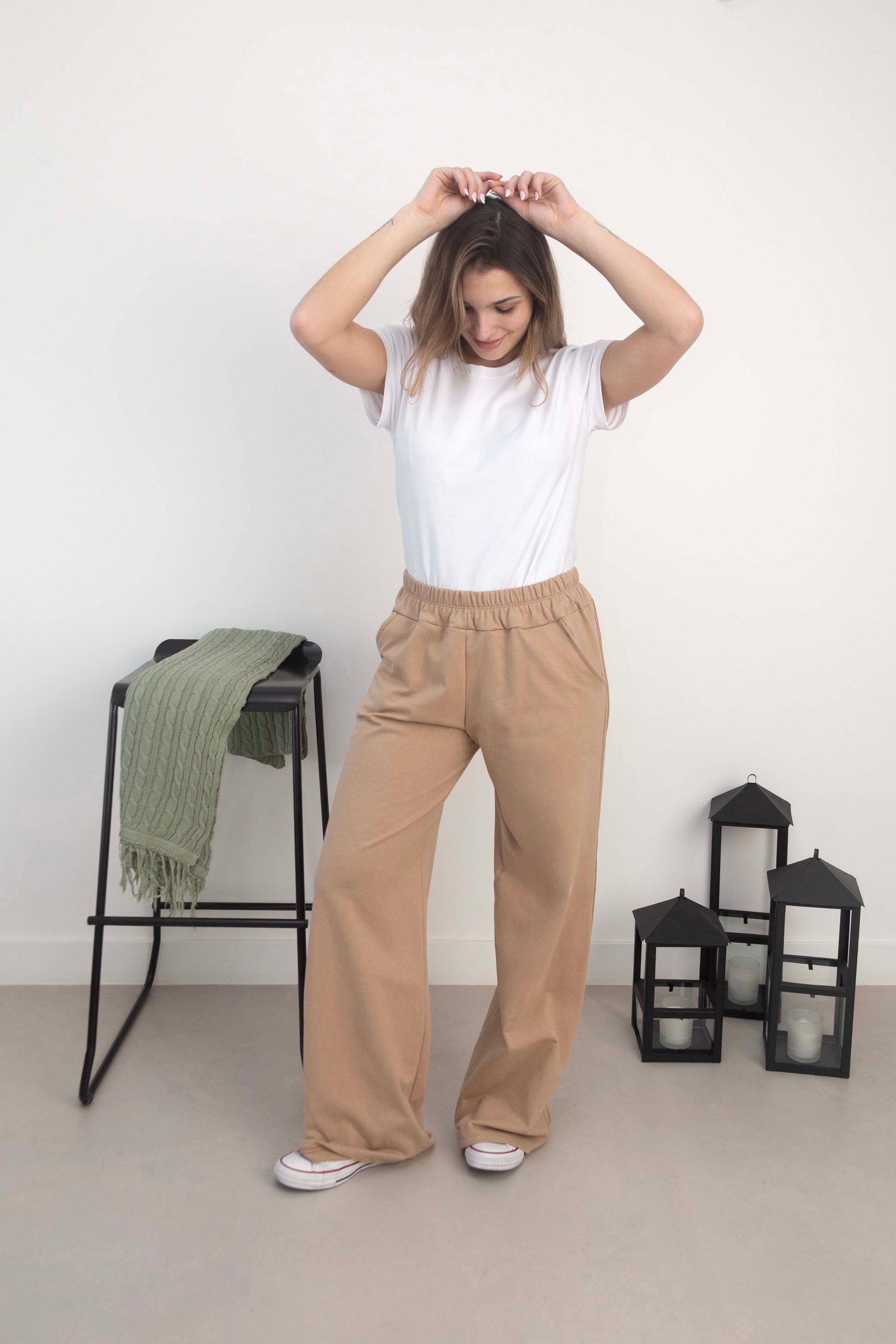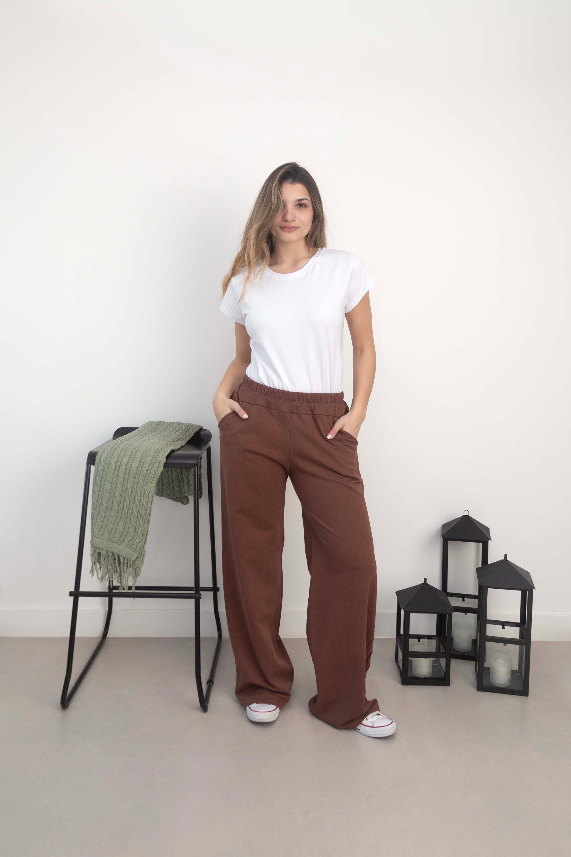Palazzo de algodón rústico, con cintura elásticada y se destaca por sus costuras laterales a lo largo de la pierna