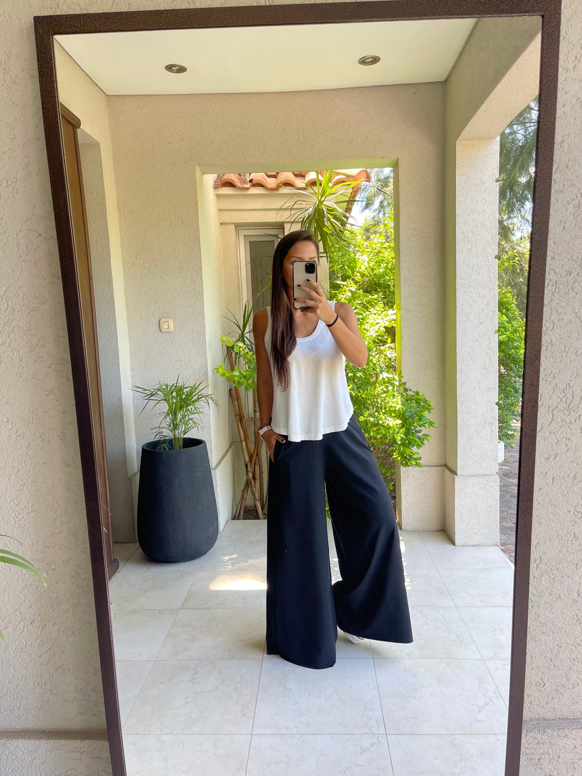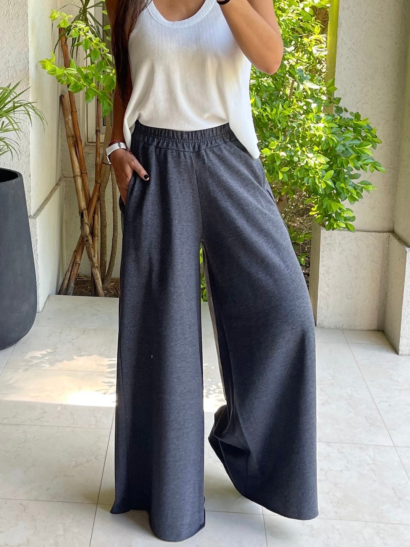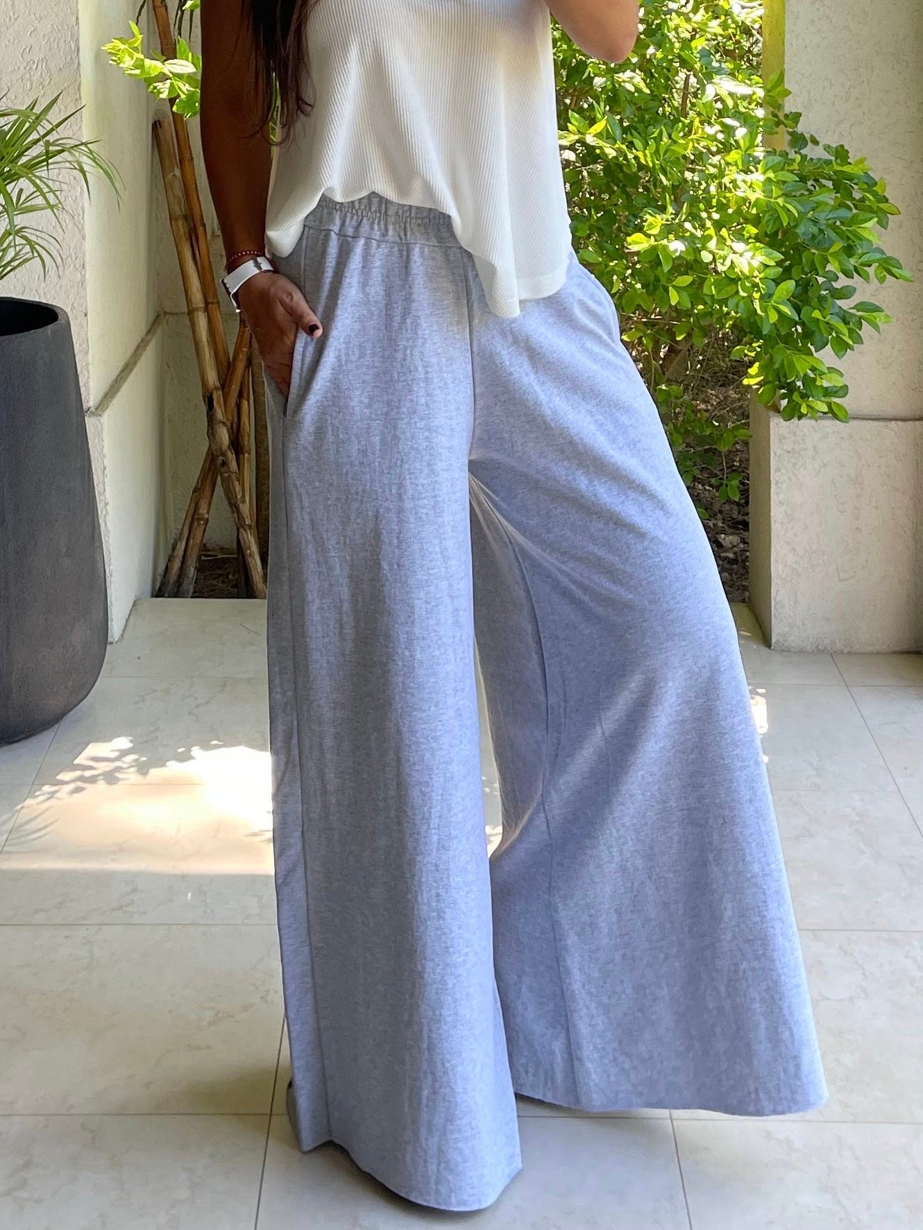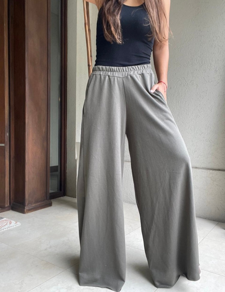 Palazzo de algodón rústico, modelo con pierna amplia, cintura elasticada y bolsillos laterales
